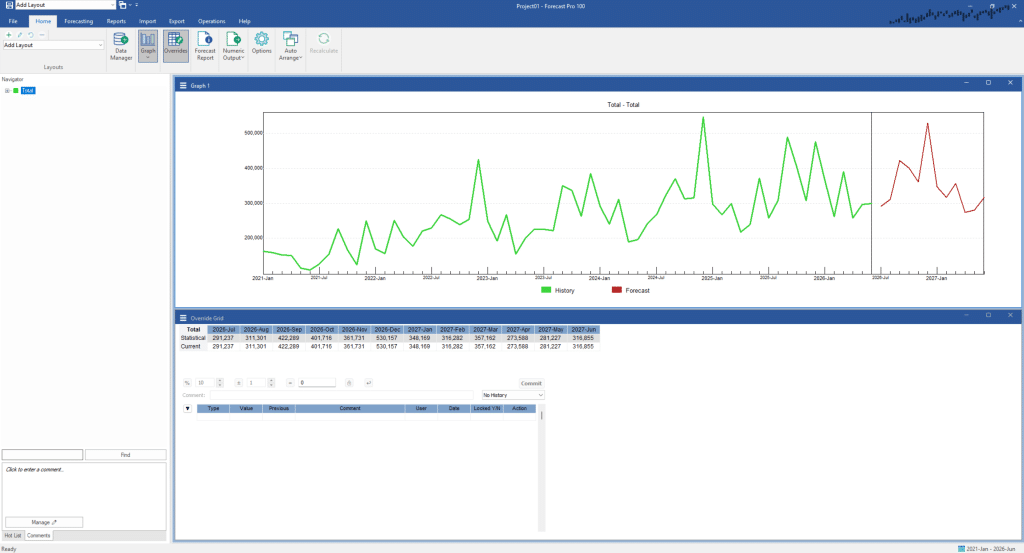 You can also customize the override grid to include rows to display history, alternative units of measure, imported information (e.g., externally generated forecasts, current orders, etc.) and calculations. Some of this advanced functionality is explored in future tutorials, and all of the functionality is described in the Reference.