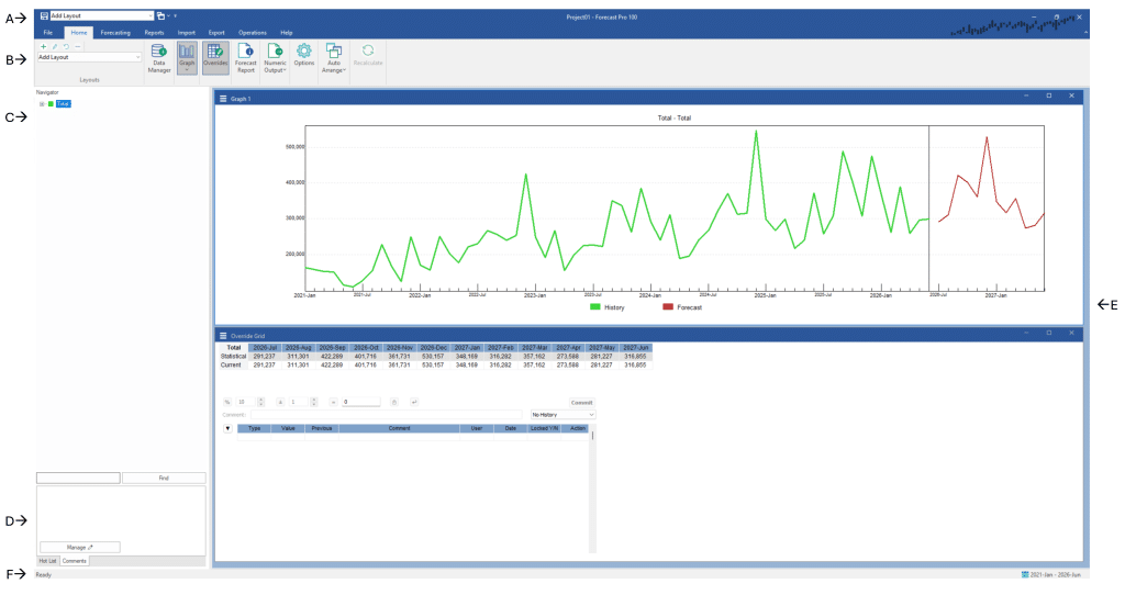 Before we explore the forecasts, let’s examine the Forecast Pro interface. The primary display consists of a Quick Access Toolbar (A), a ribbon menu (B), a Navigator (C), a Hot List & Comments area (D), and a status bar (F).