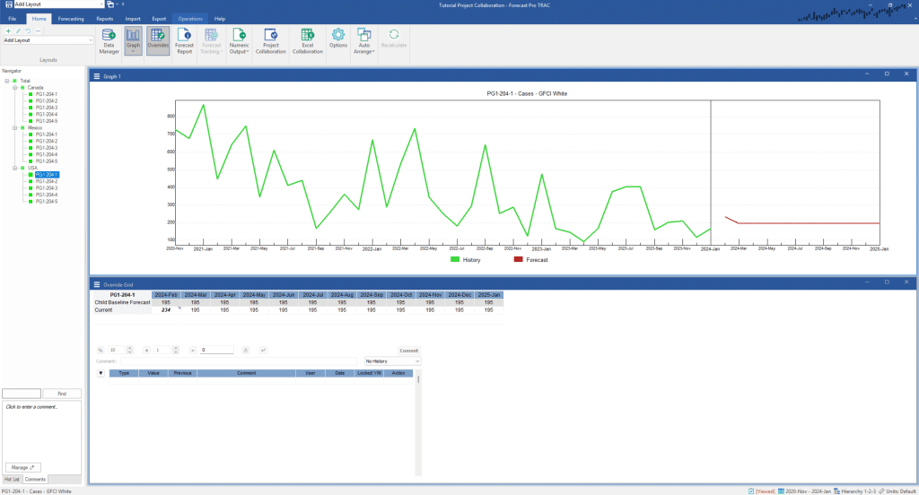 Note that the baseline is now Child Baseline Forecast. Also notice that the forecast includes the override change that was made in the child project. Forecast Pro also imports the comments associated with the applied cells.
