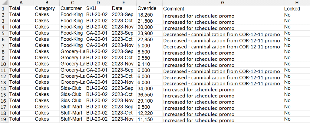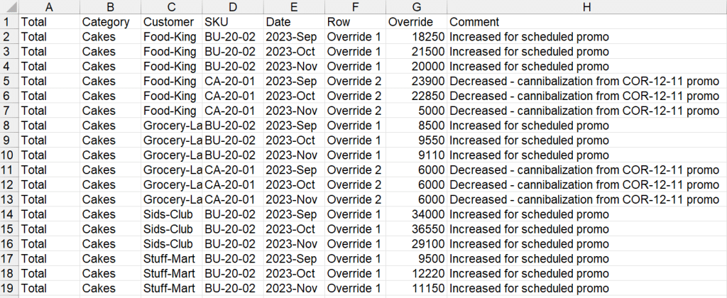 The sample file shown below is installed into the Forecast Pro input directory and is named 123 Bakery – Overrides.xlsx. Note that this file is for the standard override mode (TRAC version 8.3 or later).