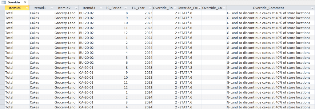 - FC_Period and FC_Year are number fields identifying the forecast date for the override.